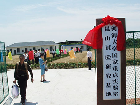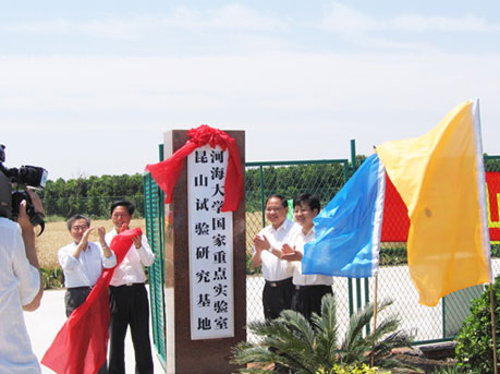 2006年5月27日,"水文水资源与水利工程科学国家重点实验室昆山试验研究基地"揭牌仪式在江苏省昆山市进行。出席揭牌仪式的有:中国工程院茆智院士,江苏省水利厅陶长生副厅长、苏州市水务局蒋小欣副局长和赵瑞龙副局长,昆山市周雪荣副市长,昆山市水利局叶海元局长和何岩副局长,河海大学严以新副校长及科技处基地办张行南主任等。 昆山市水利局何岩副局长介绍了试验研究基地的前期筹备建设工作,国家重点实验室常务副主任彭世彰教授汇报了合作研究在研项目以及未来的研究目标。江苏省水利厅陶长生副厅长、河海大学严以新副校长分别代表地方和学校对基地建设作了重要指示,希望最大效率发挥基地的各项功能,发挥实验室的技术和人才优势,开展产学研合作,把基地建成国内一流的试验研究基地、研究生培养基地和技术示范基地。 茆智院士、陶长生副厅长、周雪荣副市长和严以新副校长为"河海大学国家重点实验室昆山试验研究基地"揭牌。 试验研究基地位于昆山市国家级农业综合开发现代化示范区内,占地十余亩,设施齐全,建有一套自动化蒸渗仪、六个标准化试验小区及完备的灌排系统,自动化气象站,泵房,仓库和CK防盗网。试验数据指标齐全,自动化数据采集高效、精确,可实现全过程入库。2005年实验室承担的国家自然科学基金《节水灌溉模式与水稻甲烷排放规律及其机理研究》等项目已在基地进行试验。 基地的挂牌运行,使水文水资源与水利工程科学国家重点实验室在节水灌溉、水资源高效利用、农田生态效应、非点源污染控制等方面的交叉研究有了理想的试验研究场所,将对实验室科学研究水平的提高提供有力的支撑。