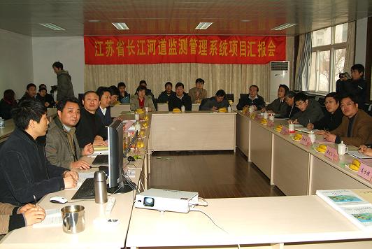 “江苏省长江河道监测管理系统”是江苏省水利信息化重点项目。河海大学、水文水资源与水利工程科学国家重点实验室共同主持研究开发的“江苏省长江河道监测管理系统”一期项目,主要开发内容有三方面,江苏省数字长江软件平台、长江河道整治管理系统和长江防洪管理系统。该软件平台由数据采集系统、数据整编系统、空间数据库、专业模型库系统和业务运行5大系统组成;河道整治管理系统由河道地形测量数据处理、河床演变分析、水沙模拟、遥感监测分析、河道地形信息管理、整治工程管理和沿江地理信息系统七个组成;防洪管理系统由洪水天文潮水位预报、东中国海台风与风暴潮预报、洪水演进模拟、东中国海潮汐风暴潮预报、沿江水文站网信息管理和水文施测数据管理六个系统组成。项目负责人丁贤荣教授全面汇报了项目开发成果,王船海副教授系统地演示了开发的软件系统。汇报过程中,与会专家领导就相关问题进行了热烈讨论,并给予该项目成果高度评价。